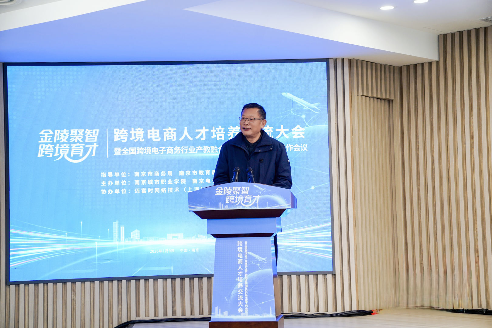 1月9日至10日,以“金陵聚智 跨境育才”为主题的跨境电商人才培养交流大会暨全国跨境电子商务行业产教融合共同体2026年度工作会议,在我校新街口校区举行。本次大会由南京市商务局、南京市教育局指导,南京城市职业学院与南京电子商务协会联合主办,来自政府部门、行业协会、职业院校及跨境电商企业的200余名代表参加。