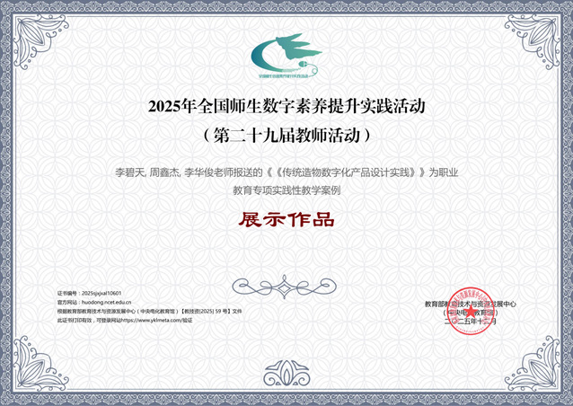 近日,由教育部教育技术与资源发展中心(中央电化教育管)举办的2025年全国师生数字素养提升实践活动(第二十九届教师活动)结果公布,数字文创学院教师李碧天、周鑫杰、李华俊(技能大师)报送的职业教育专项实践性教学案例《传统造物数字化产品设计实践》获评为展示作品。