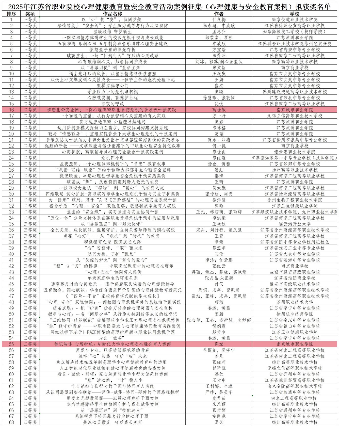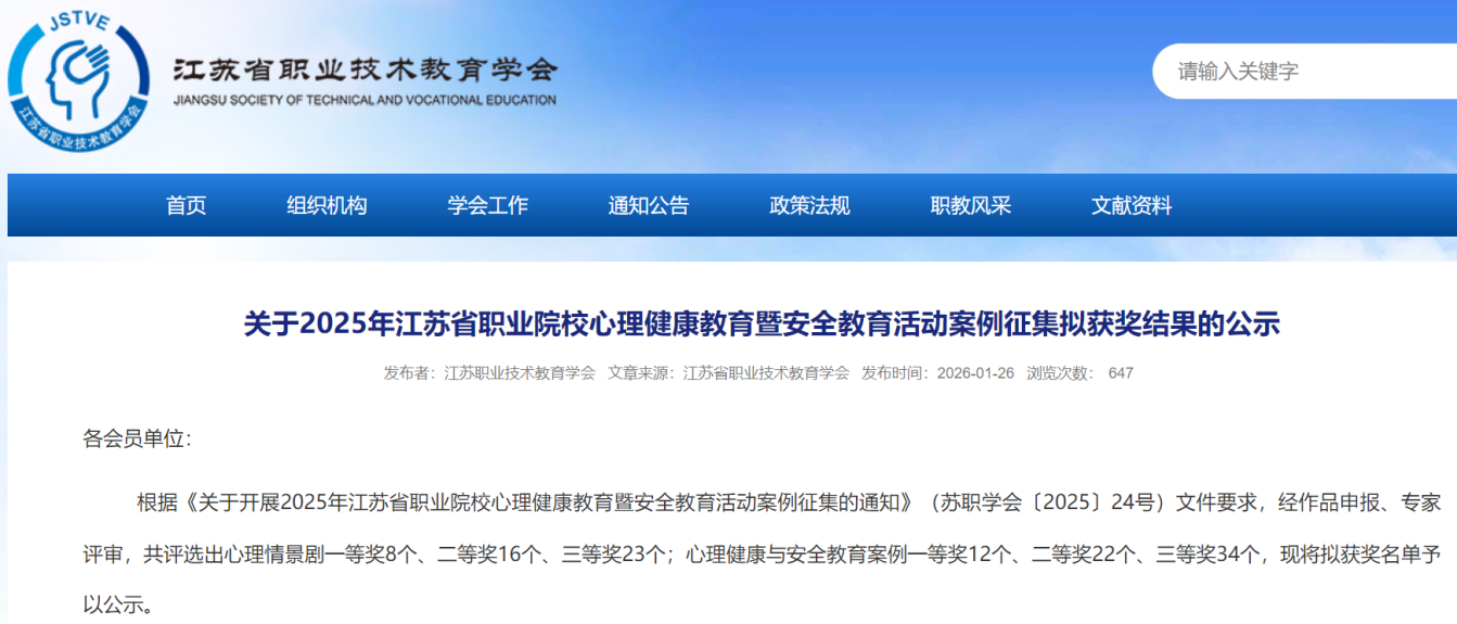 近日,2025年江苏省职业院校心理健康教育暨安全教育活动案例征集结果揭晓。我校教师积极参与,凭借扎实的专业功底与创新的育人实践喜获佳绩,充分彰显了我校心理育人工作的扎实成效与鲜明特色。