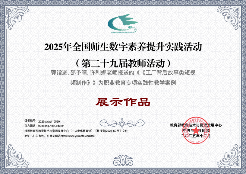 由教育部教育技术与资源发展中心主办的2025年全国师生数字素养提升实践活动评选结果正式揭晓,数字财商学院郭诣遂、许利娜、邵予晴老师报送的三项实践性教学案例作品成功获评职业教育专项展示作品。