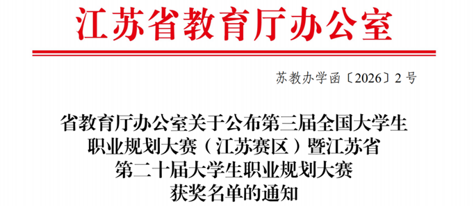 2025年10月至12月,江苏省教育厅组织开展第三届全国大学生职业规划大赛(江苏赛区)暨江苏省第二十届大学生职业规划大赛,旨在加强高校生涯教育和就业指导,增强大学生生涯规划意识,促进高校毕业生高质量充分就业。我校选送5名选手进入省级复赛,其中,数字文创学院刘诗雨同学、康养工程学院尹雪同学均取得铜奖佳绩。相较往年,我校获奖数量进一步增加。