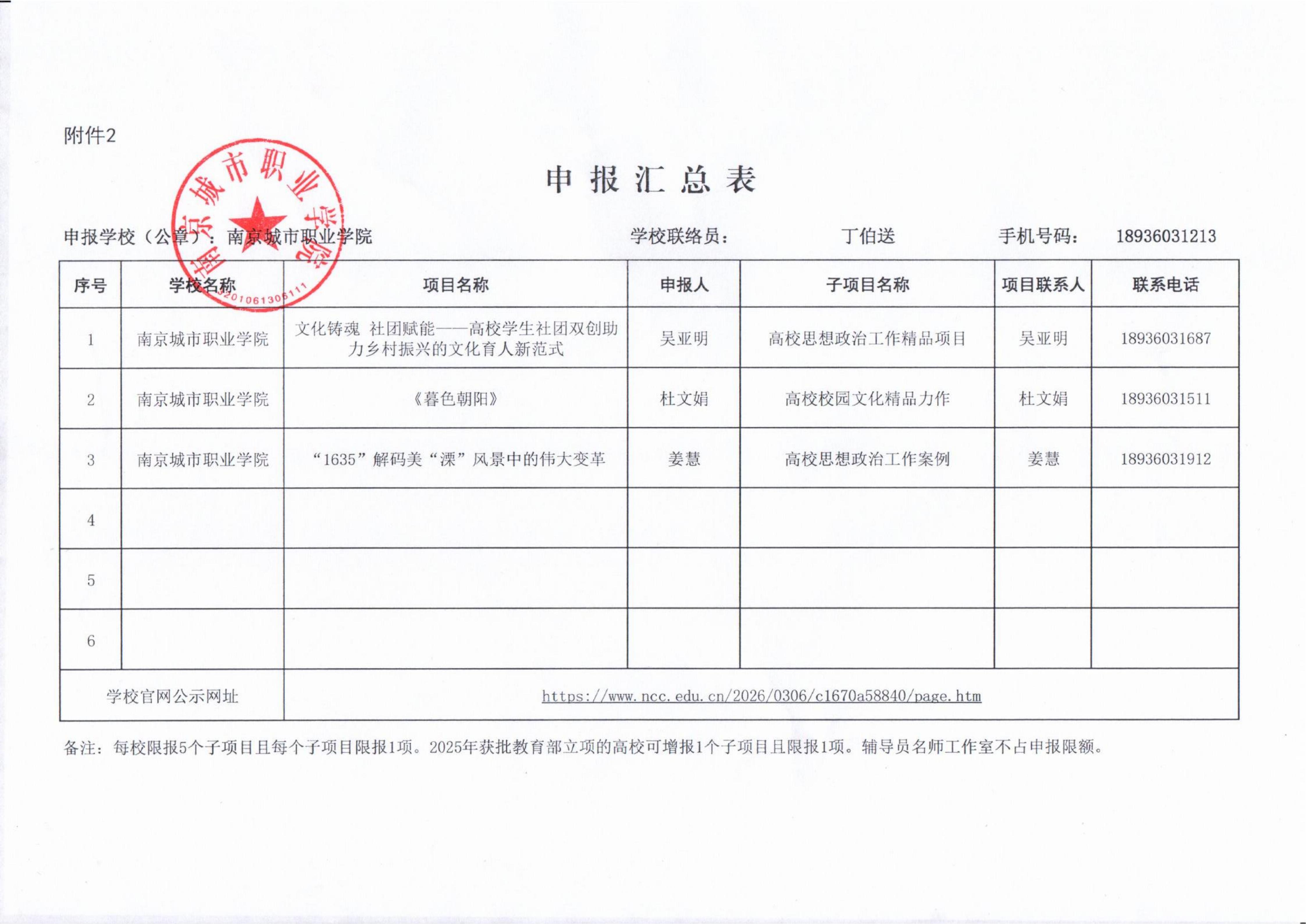 根据《教育部办公厅关于启动2026年度高校思想政治工作质量提升综合改革与精品建设项目申报工作的通知》(教思政厅函〔2026〕1号)及《省教育厅办公室关于做好教育部2026年度高校思想政治工作质量提升综合改革与精品建设项目和第四批省级项目申报工作的通知》(苏教办社政函〔2026〕2号)有关要求,经各部门申报、相关部门材料审核和校外专家评审,拟推荐以下3个项目,现予以公示。