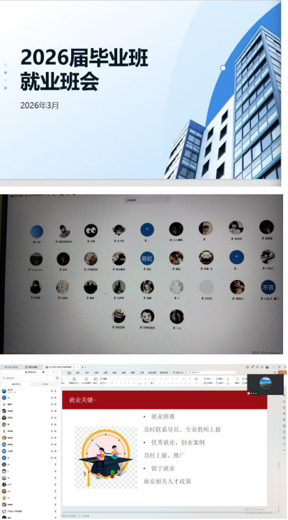 围绕毕业学年关键阶段的就业工作,辅导员鼓励同学们,尽早明确就业方向与目标,牢牢把握当前找工作、定岗位的黄金时期;重视岗位实习环节,严格遵守实习单位规章制度,注意实习期间的工作安全,在实践中积累经验、提升能力;积极参加目前正在开展的“启航南京”就业指导培训提升就业能力,上报优秀就业、创业案例,发挥榜样示范作用。学生如遇就业困难可及时向辅导员、专业教师反馈,有创业意愿的毕业生也可联系申请学校大学生创业园区场地。