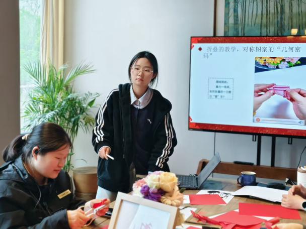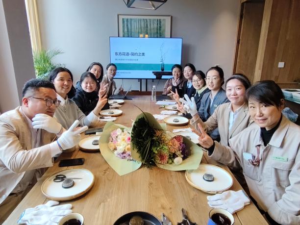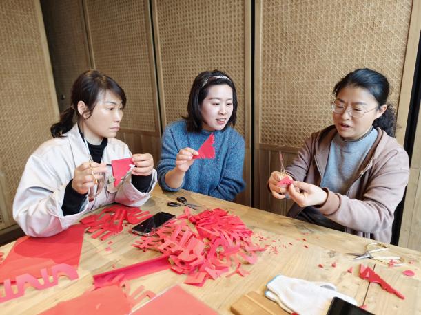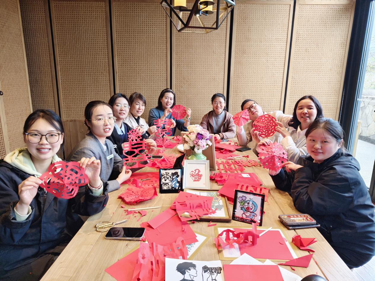 下午的中式插花课程中,李海霞老师结合东方插花的历史渊源与艺术特色,从花材选择、色彩搭配、构图技巧等方面进行详细讲解,通过现场演示与手把手指导,让员工们迅速掌握中式插花的基础技法,感受传统花艺的雅致韵味。章明霞老师与非遗剪纸项目负责学生张桂玉携手开展非遗剪纸培训,通过作品展示、技法讲解、动手实践等环节,向员工介绍剪纸艺术的文化寓意与基本技法,带领大家体验折纸、剪刻的乐趣,深入感受非遗文化的独特魅力。